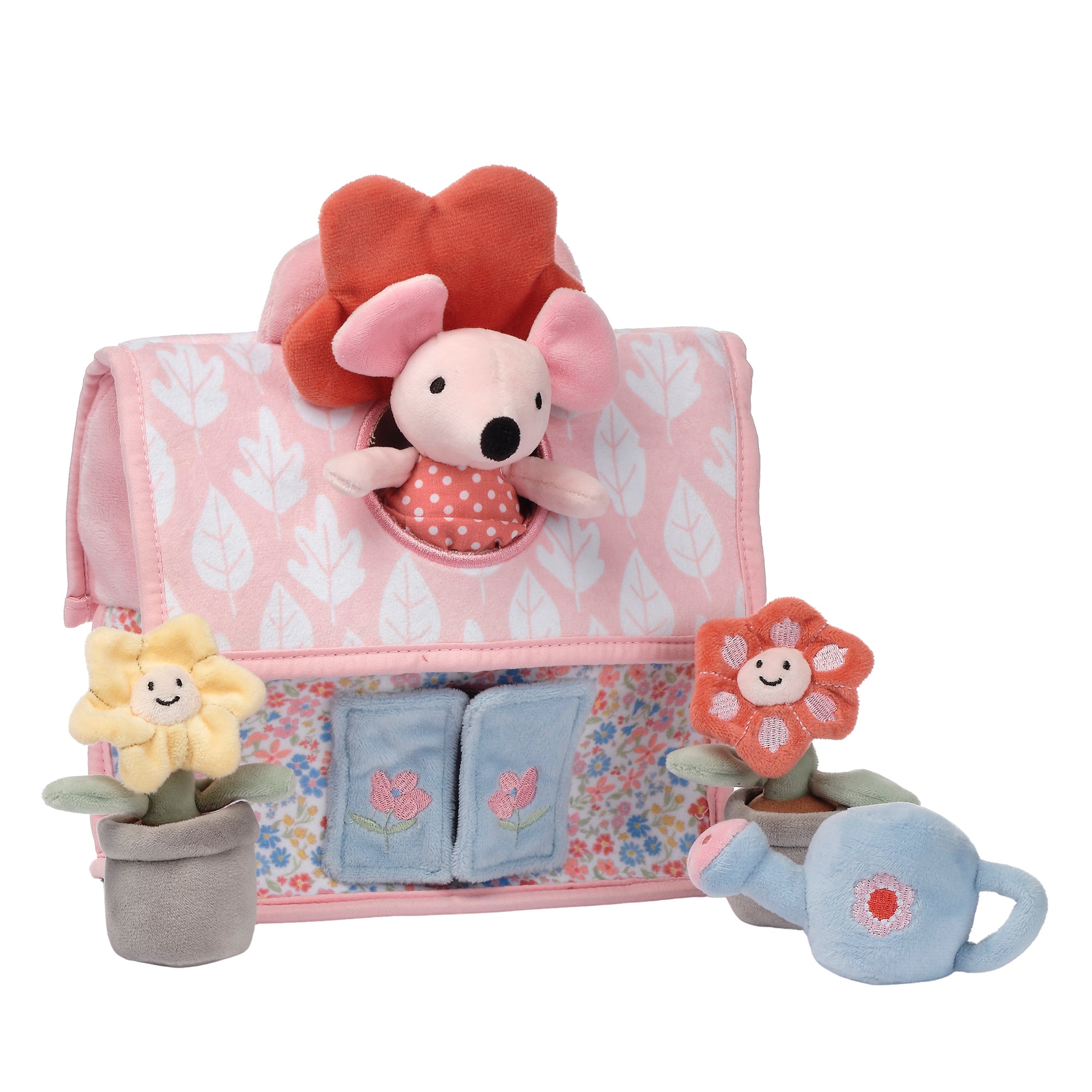 Welcome your child to a world of imaginative playtime with this charming Garden Cottage Plush Interactive Set. It comes complete with a soft cozy flower themed cottage. a cute little resident mouse. two potted flowers. and a watering can. The cottage is made in pastel velour colors. is decorated in pretty pastel flowers. and includes a handle for carrying on the go. It even has an interactive skylight on the roof underneath a pink flower that lets your little one peek inside and is great for fine motor skills development. The light blue double door with embroidered flowers is in the front and the orange velour back door is also embroidered with three small pink flowers. Our friendly little mouse. dressed up in a sweet polka-dot dress. adds to the fun. Complete this playful garden scene with two velour plush potted flowers and a light blue velour watering can. Children can play hide and seek by putting the characters in and out of the numerous openings as they learn about object permanence. This soft plush play set is the perfect gift for any baby or toddler. SKU: 719043GC. UPC: 084122018563.